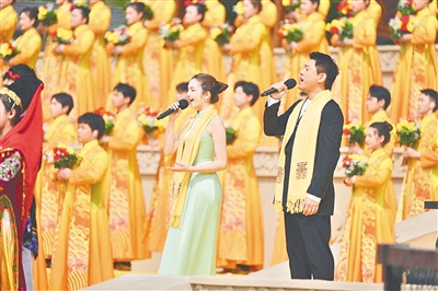 高唱頌歌。來自香港地區(qū)的鐘鎮(zhèn)濤、臺(tái)灣地區(qū)的朱孝天和澳門地區(qū)的麥嘉欣以及內(nèi)地的曹芙嘉,與56個(gè)民族的少年兒童一起,同歌《黃帝頌》,共聚家國(guó)情。