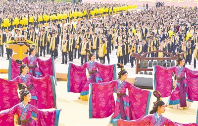 恭讀拜文。“粵稽遐古,天地洪荒,具茨綿綿,我祖是降……”王光謙登上拜祖臺(tái),以全球華人之名,肅手恭頌。