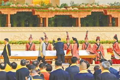 祈福中華。拜祖臺(tái)上,一幅波濤壯闊的黃河畫卷徐徐展開。古小玉、何新、劉家強(qiáng)、符之冠、陸進(jìn)、徐顯明、孫達(dá),中央統(tǒng)戰(zhàn)部九局二級(jí)巡視員孫彥濤,國(guó)家文化和旅游部一級(jí)巡視員王鶴云,中國(guó)工程院院士、全國(guó)勘察設(shè)計(jì)大師何鏡堂,中國(guó)工程院院士、第二屆國(guó)醫(yī)大師王琦,中國(guó)工程院院士、華東合成生物產(chǎn)業(yè)技術(shù)研究院負(fù)責(zé)人鄭裕國(guó),全國(guó)政協(xié)委員、北京大學(xué)教授張頤武,中國(guó)文聯(lián)書記處原書記、中國(guó)電影家協(xié)會(huì)分黨組原書記張宏,中國(guó)美術(shù)家協(xié)會(huì)分黨組書記、中國(guó)美術(shù)家協(xié)會(huì)副主席馬鋒輝,中國(guó)戲劇家協(xié)會(huì)分黨組書記、駐會(huì)副主席陳涌泉,中國(guó)食品藥品企業(yè)質(zhì)量安全促進(jìn)會(huì)會(huì)長(zhǎng)毛振賓,國(guó)學(xué)專家、講席教授、北京中醫(yī)藥大學(xué)國(guó)學(xué)院創(chuàng)院院長(zhǎng)張其成,知名學(xué)者、浙江大學(xué)求是特聘教授鄭強(qiáng),資深媒體專家胡錫進(jìn),中歐經(jīng)濟(jì)文化研究發(fā)展中心會(huì)長(zhǎng)柯海嘯,中國(guó)男高音歌唱家、河南音樂學(xué)院院長(zhǎng)戴玉強(qiáng),河南鄧亞萍體育產(chǎn)業(yè)投資基金董事長(zhǎng)鄧亞萍,全國(guó)政協(xié)委員、知名作家蔣勝男,首屆岐黃學(xué)者、河南中醫(yī)藥大學(xué)校長(zhǎng)王耀獻(xiàn),全國(guó)人大代表、依文集團(tuán)董事長(zhǎng)夏華,同仁堂集團(tuán)董事長(zhǎng)王貴平,香港中資基金業(yè)協(xié)會(huì)會(huì)長(zhǎng)連少冬,中鐵工程裝備集團(tuán)有限公司董事長(zhǎng)趙華,國(guó)家級(jí)非物質(zhì)文化遺產(chǎn)石雕項(xiàng)目代表性傳承人劉紅立,在畫卷上蓋印,以黃河為證,祝福國(guó)家安泰、海宇寧謐。