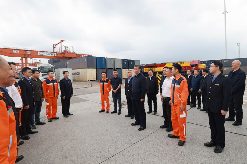 4月22日至24日,中共中央總書記、國家主席、中央軍委主席習(xí)近平在重慶考察。這是22日下午,習(xí)近平在重慶國際物流樞紐園區(qū)重慶鐵路集裝箱中心站,同貨車司機(jī)、列車司機(jī)、裝卸工人、場(chǎng)站管理人員等親切交流。新華社記者 岳月偉 攝