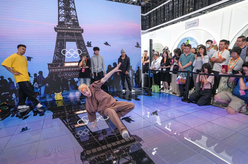 2024年9月14日,在2024年服貿(mào)會國家會議中心綜合展區(qū)的主賓國法國展臺,中法兩國街舞好手在表演霹靂舞。新華社記者 陳曄華 攝