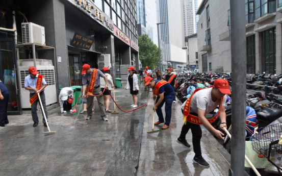 二、“全城清潔”行動。清潔家園,黨員志愿者義不容辭。日前,市建投聯(lián)合商務(wù)社區(qū)積極響應(yīng)“全城清潔”行動號召,定期組織志愿者對社區(qū)單位公共區(qū)域、沿街商戶門店等內(nèi)外環(huán)境進(jìn)行集中整治。7月14日下午,市建投黨員志愿者分赴中國人保大廈對沿街商戶門店和街道進(jìn)行集中清理。大清掃活動采取包干打掃、分頭行動的方式,集中對沿街商鋪門店垃圾桶(池)、地面污漬等進(jìn)行清洗,全面清理整治各類衛(wèi)生死角,清理積存垃圾,杜絕垃圾亂堆亂放。烈日炎炎,市建投黨員志愿者們絲毫不懼37度的高溫,頭戴小紅帽,戴著紅袖標(biāo),以高度的敬業(yè)態(tài)度和為人民服務(wù)的無比熱情,全身心投入到環(huán)境衛(wèi)生清理中,通過2個小時的辛苦勞動,使人保大廈沿街門店商鋪和街道面貌煥然一新。