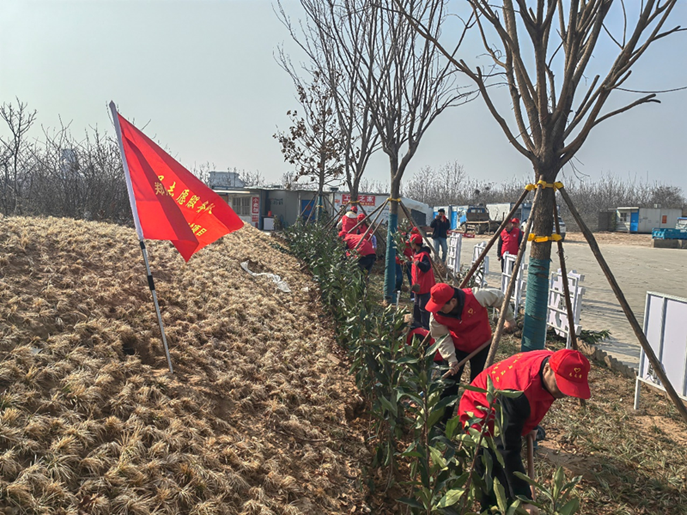3月12日,陽光明媚,春意盎然,黨員志愿服務(wù)隊(duì)士氣高昂,手拿鐵鍬、水桶、掃把等工具,熱情高漲地投入到植樹活動中。