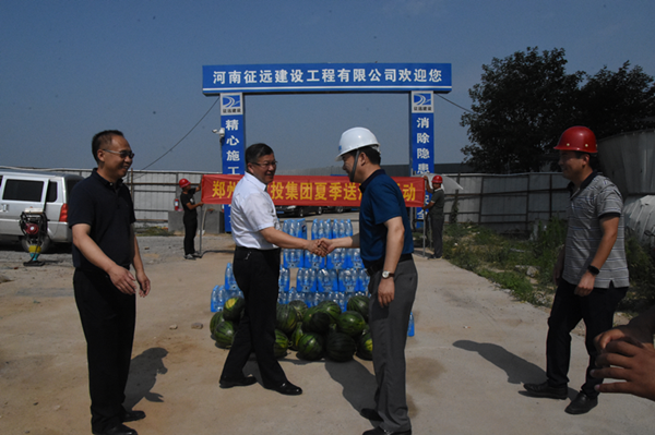盛夏時節(jié),高溫炎熱。6月22日上午,由集團(tuán)公司黨委和工會主辦,市政工程建設(shè)管理中心、綜合部、黨群部承辦的“送清涼、保健康、促和諧”慰問活動,走進(jìn)市政工程建設(shè)施工現(xiàn)場,為烈日下辛勤工作的一線工人兄弟送去西瓜、水等防暑降溫物資,送上集團(tuán)公司的親切關(guān)懷和問候。